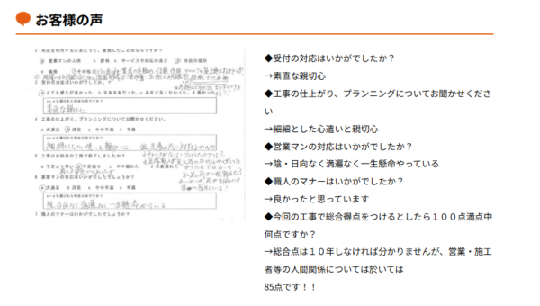 例えば、松原市N様邸では、受付や営業マン、職人の対応について「とても感じが良かった」「満足」と評価され、施工金額についても「適切」との声がありました。総合評価は90点と高く、全体として納得いただけました。