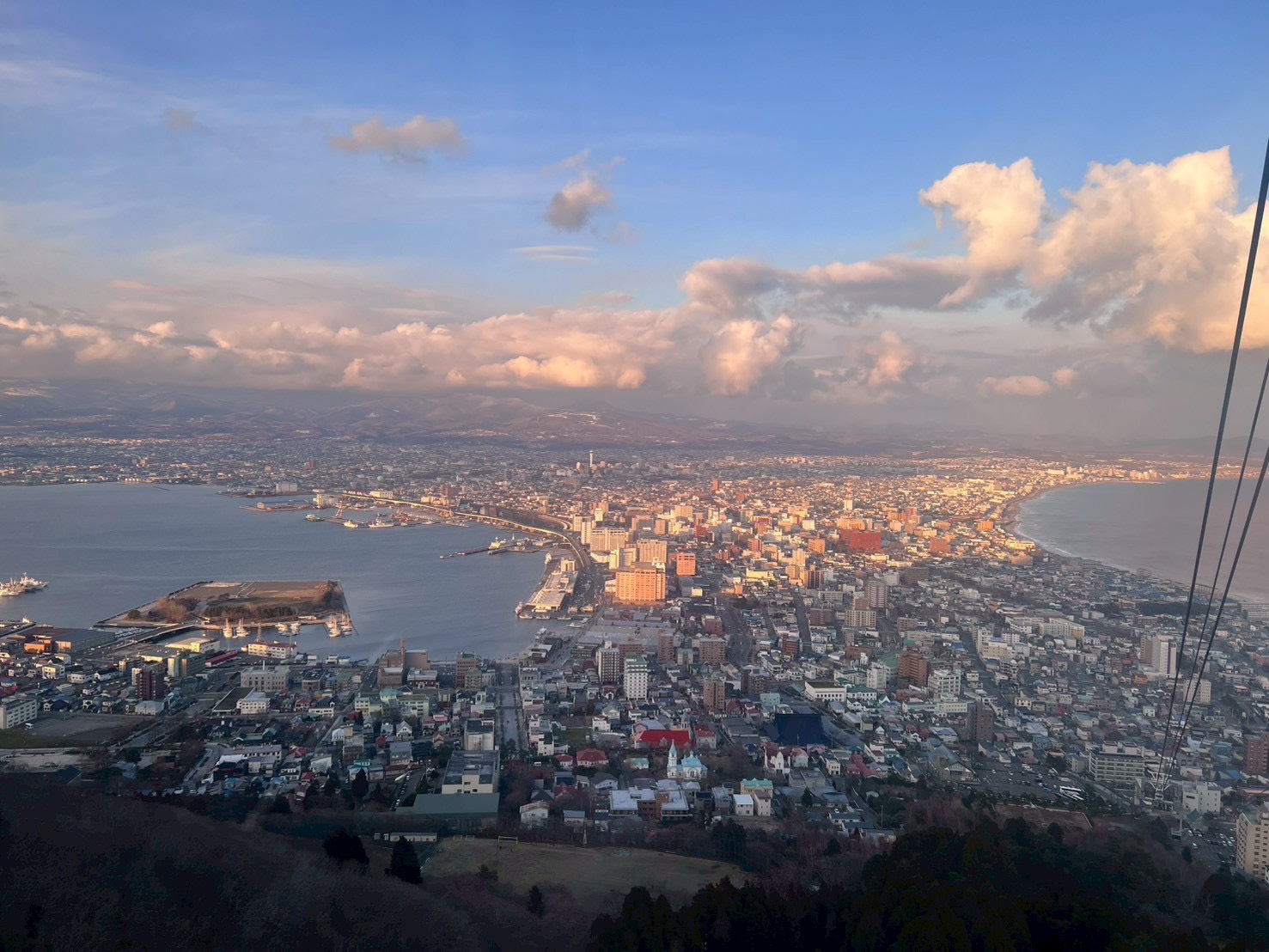 夕暮れ時は函館山ロープウェイへ。時間の都合上、一番のピークは逃してしまいましたが、それでも眼下に広がる夕景は息を呑む美しさ。まさに「100万ドルの夜景」の序章を感じさせる、印象深い景色でした。
