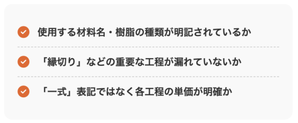 高圧洗浄、下地調整、下塗り・中塗り・上塗りといった各工程の単価と数量が明示されているかを確認しましょう。